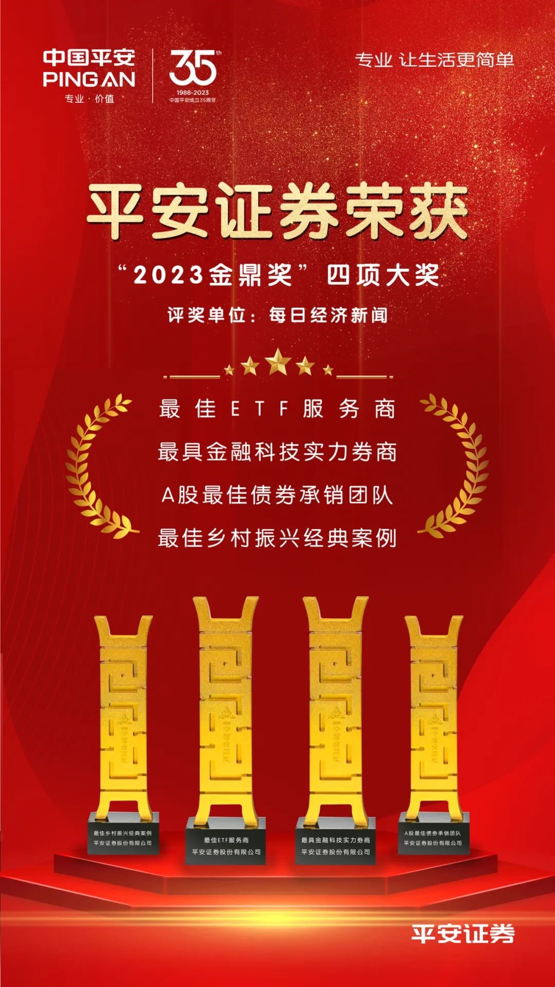 平博体育,平博体育官网,平博体育APP下载11月3日,由每日经济新闻主办的“2023资本市场高质量发展峰会”在深圳举办,2023金鼎奖也在峰会中重磅揭晓。平安证券凭借在ETF服务、金融科技发展、债券承销及助力乡村振兴方面的突出表现和成果,荣获2023年度“最佳ETF服务商”“A股最佳债券承销团队”“最具金融科技实力券商”“最佳乡村振兴经典案例”四项大奖。