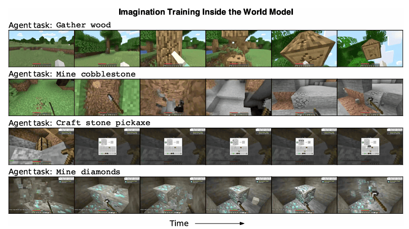 与这一理论思路相呼应的,是Google DeepMind的实践路线。相较于OpenAI倾向规模化涌现的策略,Google更重视模型的可控性、可编辑性与物理一致性。其最新发布的Dreamer 4模型,也是一种以世界模型为核心的智能体架构。它通过在《Minecraft(我的世界)》等内部环境中进行 “想象训练(imagination-based training)”,借助高效的Transformer架构与可微分物理机制,能够在不依赖外部交互的情况下准确模拟环境动态,从而实现策略学习与行为决策。这意味着,Google并非仅在视频生成上追求真实,而是在更底层通过内部世界的构建,推动AI对现实规律的自我理解。