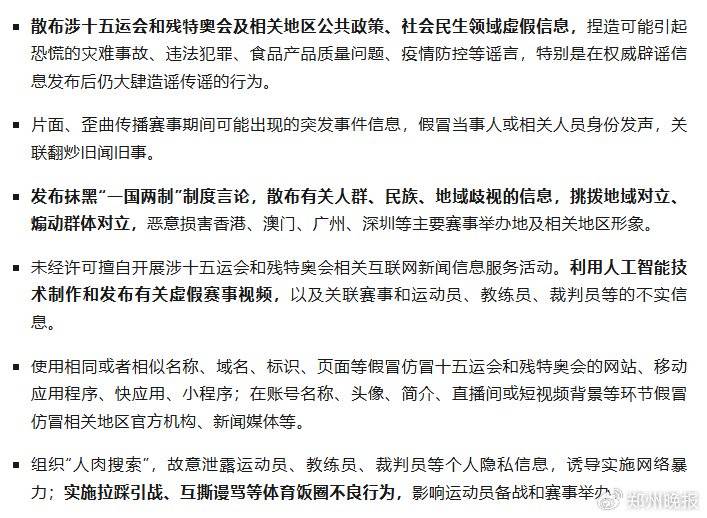 11月4日,中央网信办发布通知,决定自11月4日至12月20日开展“清朗·十五运会和残特奥会网络环境整治”专项行动,集中整治以下6类突出问题: