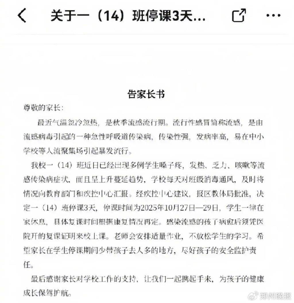 绍兴某学校一班级多名学生出现嗓子疼、发热、咳嗽,该班通知:停课3天。河南疾控发布提醒:目前,河南省流行性感冒呈现波动上升趋势,随着传统流行季到来和近期气候转冷,流感活动可能会逐步上升,引起季节性流行,在学校、托幼机构和养老院等人群聚集的场所可发生暴发疫情。