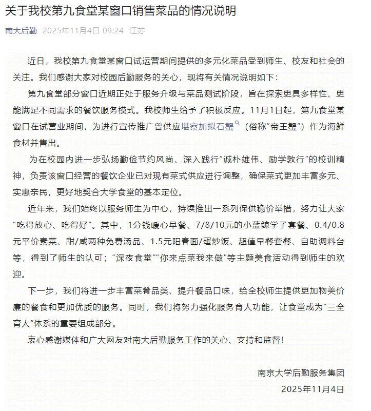 11月4日,南京大学后勤通报食堂卖999元“帝王蟹”:为试营业,已调整现有菜式,确保菜式丰富多元、实惠亲民。