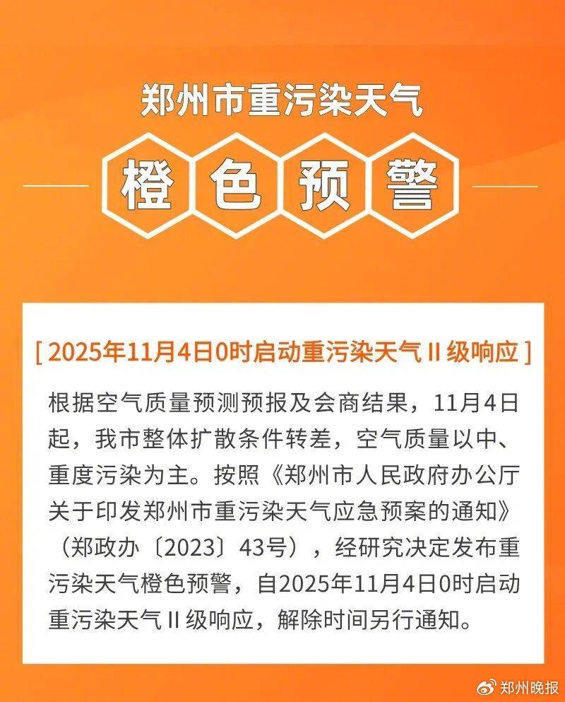 郑州市11月4日0时启动重污染天气Ⅱ级响应。另据河南省生态环境监测和安全中心预测,受不利气象条件影响,11月4日起,河南部分地区可能出现中度至重度污染风险。对此,河南洛阳、焦作、济源、濮阳、周口等地于11月4日0时启动重污染天气橙色(Ⅱ级)预警响应,解除时间另行通知。