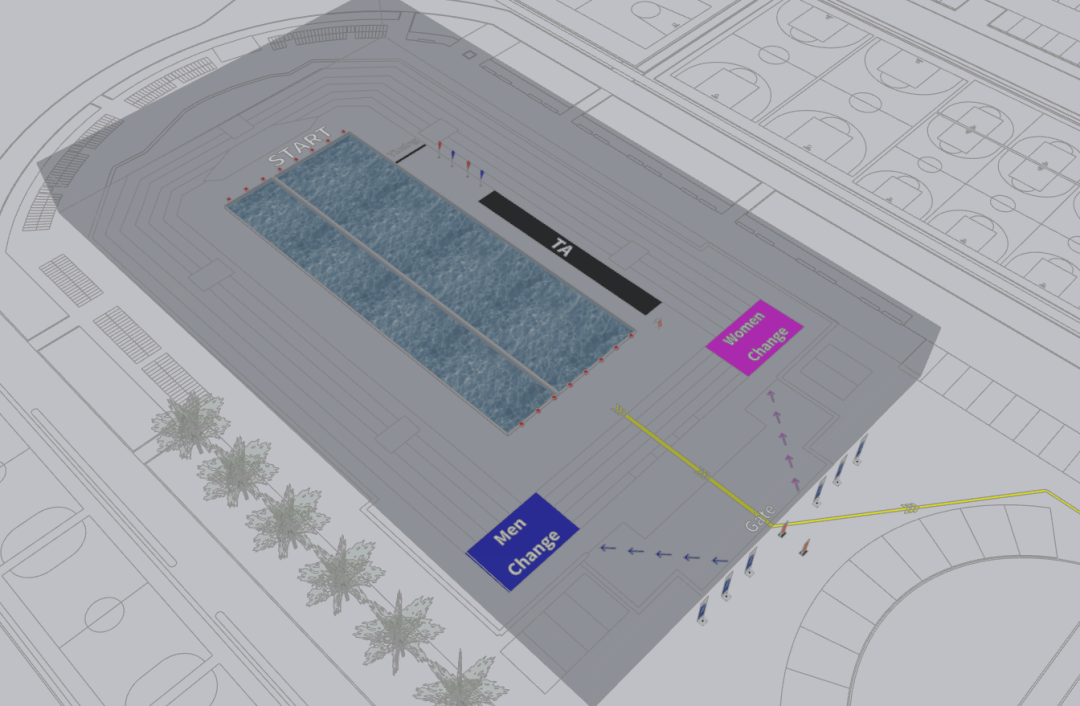 7)选手进入游泳场馆,经过男女更衣室更衣,随后至换项区准备, 游泳上水后从黄色动线出发至骑行台区域(如上水后需至更衣区进行更衣,仍需返回至黄色动线出发至骑行区)。所有物品必须放置于组委会提供的换项框内,禁止存放在更衣区。
