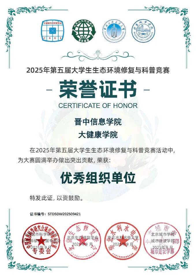 由山西省大气探测技术保障中心支部委员会主办的大学生气象科普社会实践活动中,学校远景学院王琰鹏、和艺群、侯雅茜、澹台旭辰、袁悦婷、刘婉银、马淑慧获得志愿服务证书。