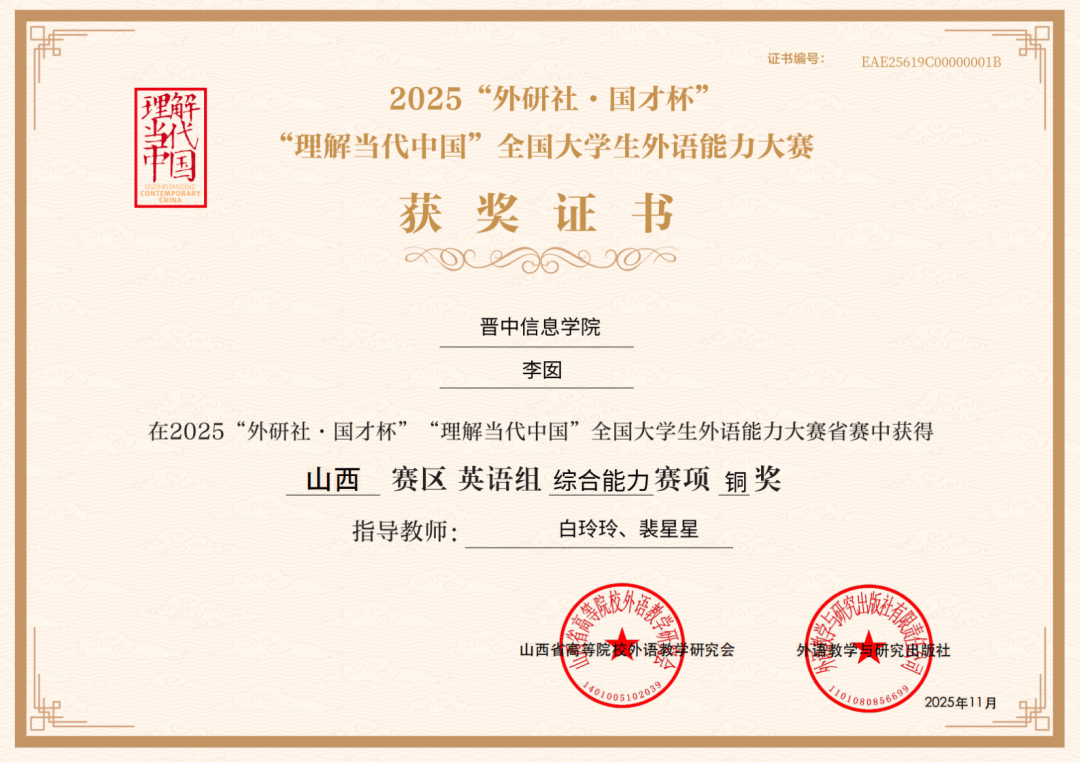 在2025“外研社·国才杯”理解当代中国全国大学生外语能力大赛省赛中学校学生韩文婧、李一来荣获山西赛区英语组演讲赛项铜奖;伦新秀老师指导李一来同学荣获山西赛区英语组演讲赛项铜奖;校赛英语组综合能力赛项,周曼、刘月荣获银奖;王永义获德语语组铜奖;李囡获综合能力赛项铜奖;李一来获演讲赛项铜奖。