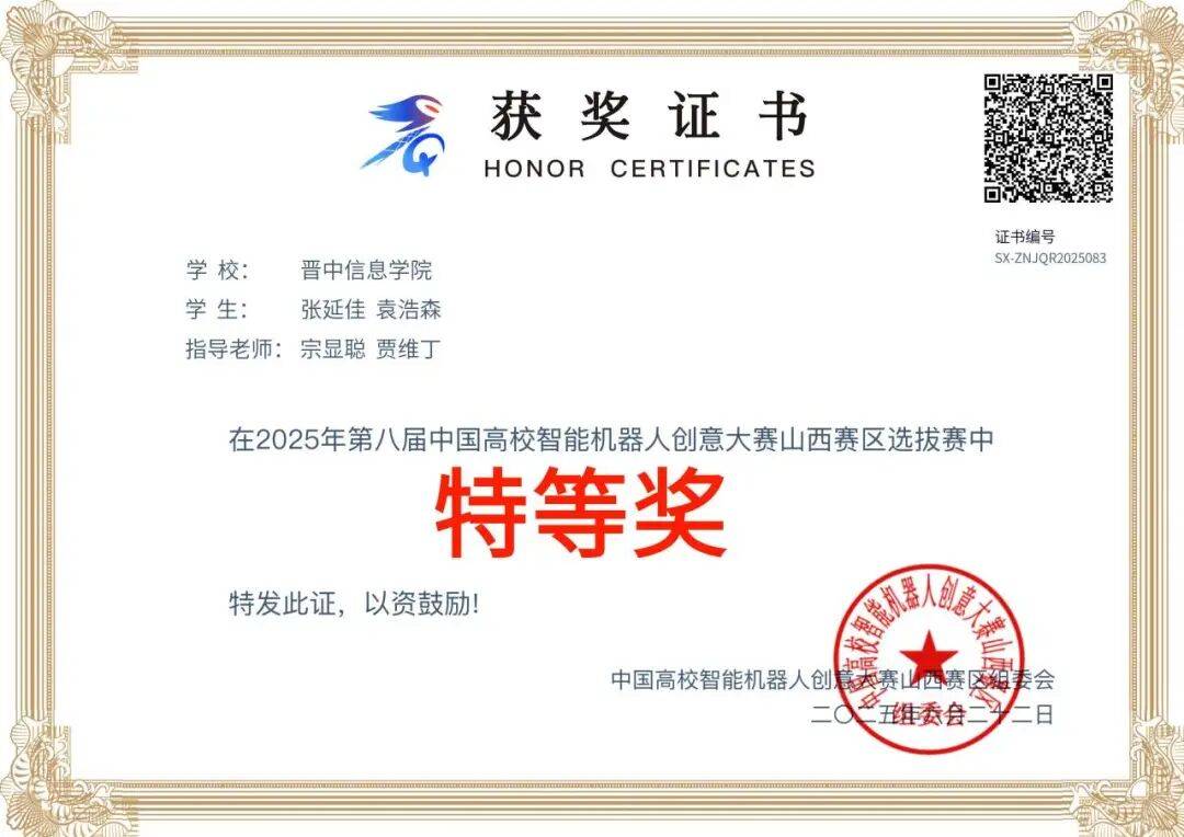 在2025年第八届中国高校智能机器人创意大赛山西赛区选拔赛中任晨睿等同学荣获特等奖。