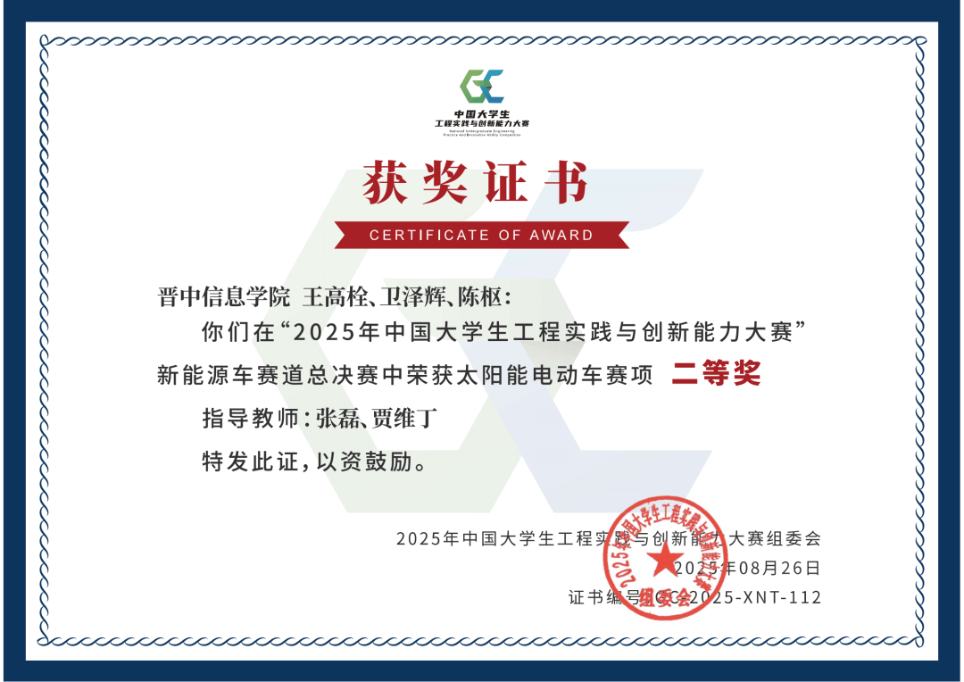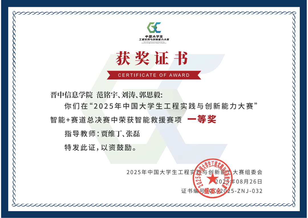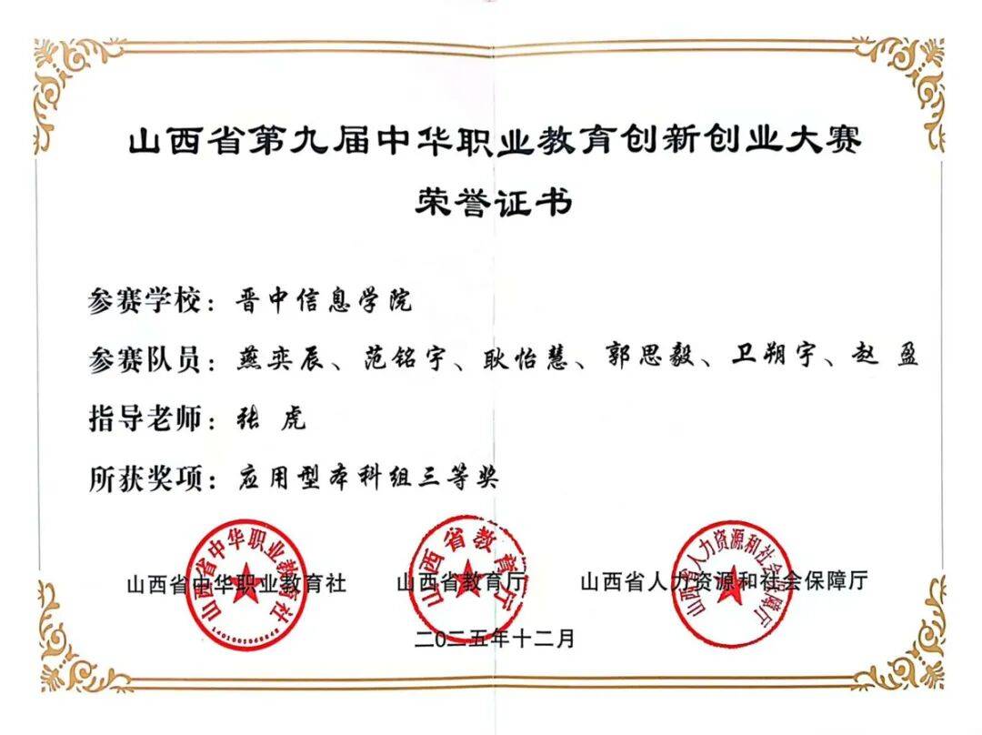 由省内高校、中国大学生计算机设计大赛组织委员会举办的2025中国大学生计算机设计大赛山西省赛中胡鸿涛、苏彤、梁文华、冯梓鹏、刘煜辉、景晔获一等奖。