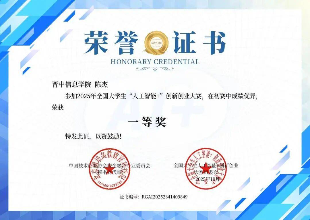 由中国技术创业协会校企融合专业委员会和全国大学生人工智能+ 创新创业大赛组委会举办的2025年全国大学生陈利红老师指导的作品《基于00后视角下立足“英语+”探寻霍州署民族基因调研报告》获三等奖“人工智能”+创新创业大赛中学校远景学院吕清銥等36位同学荣获全国一等奖。