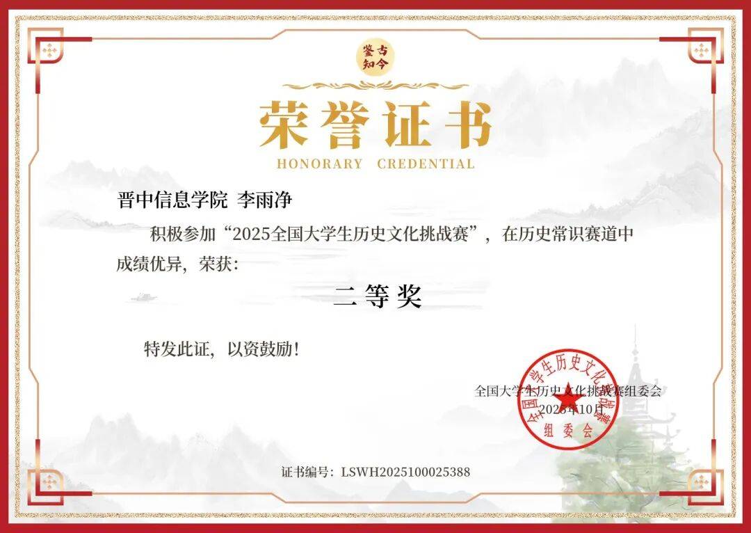 在2025年全国大学生历史文化挑战赛历史常识赛道,高美丽老师指导李雨净同学荣获二等奖。