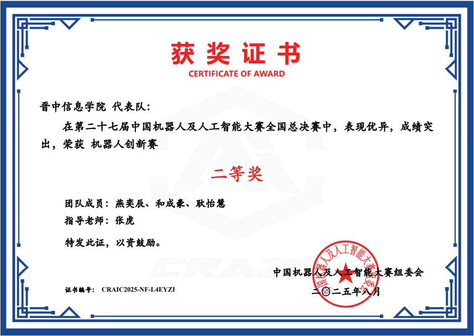 第二十七届中国机器人及人工智能大赛山西赛区比赛,晋中信息学院代表队(燕奕辰、和成豪、耿怡慧,张虎指导)荣获机器人创新赛二等奖。