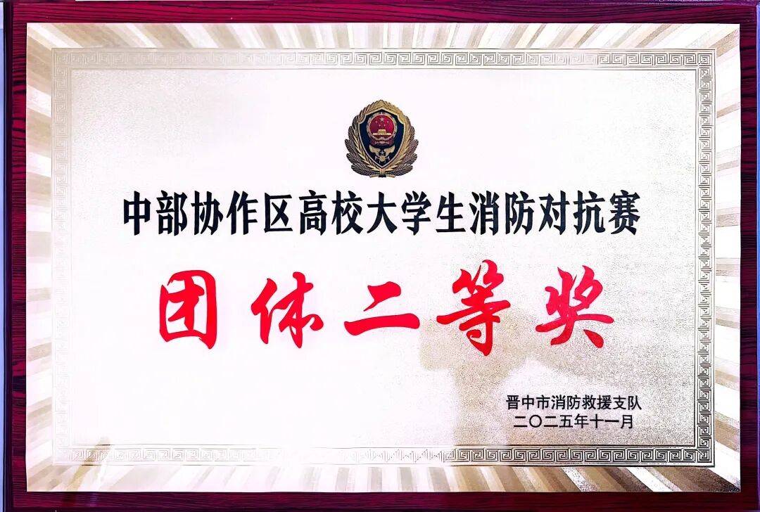 由晋中市消防救援支队主办的中部协作区高校大学生消防对抗赛中杜佳炜获“原地着战斗服”二等奖;杜佳炜、孙博薇、安文龙、张晨、史思恒、杨欣格、张晋瑞、刘怡君、郑智超、任亚婷获得团体二等奖。