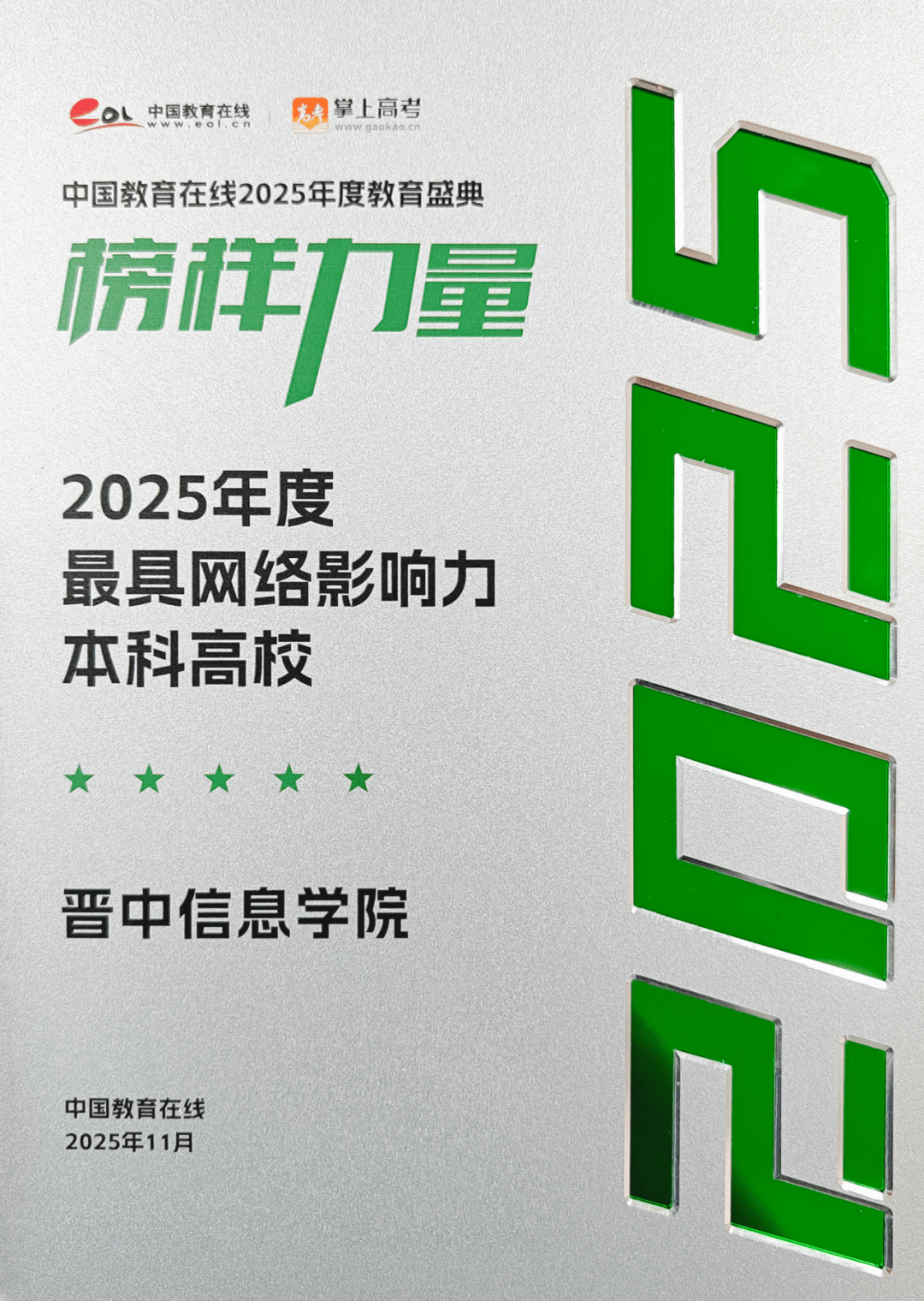 中国教育在线年度教育盛典优秀案例名单,晋中信息学院获评“2025年度最具网络影响力本科高校”。