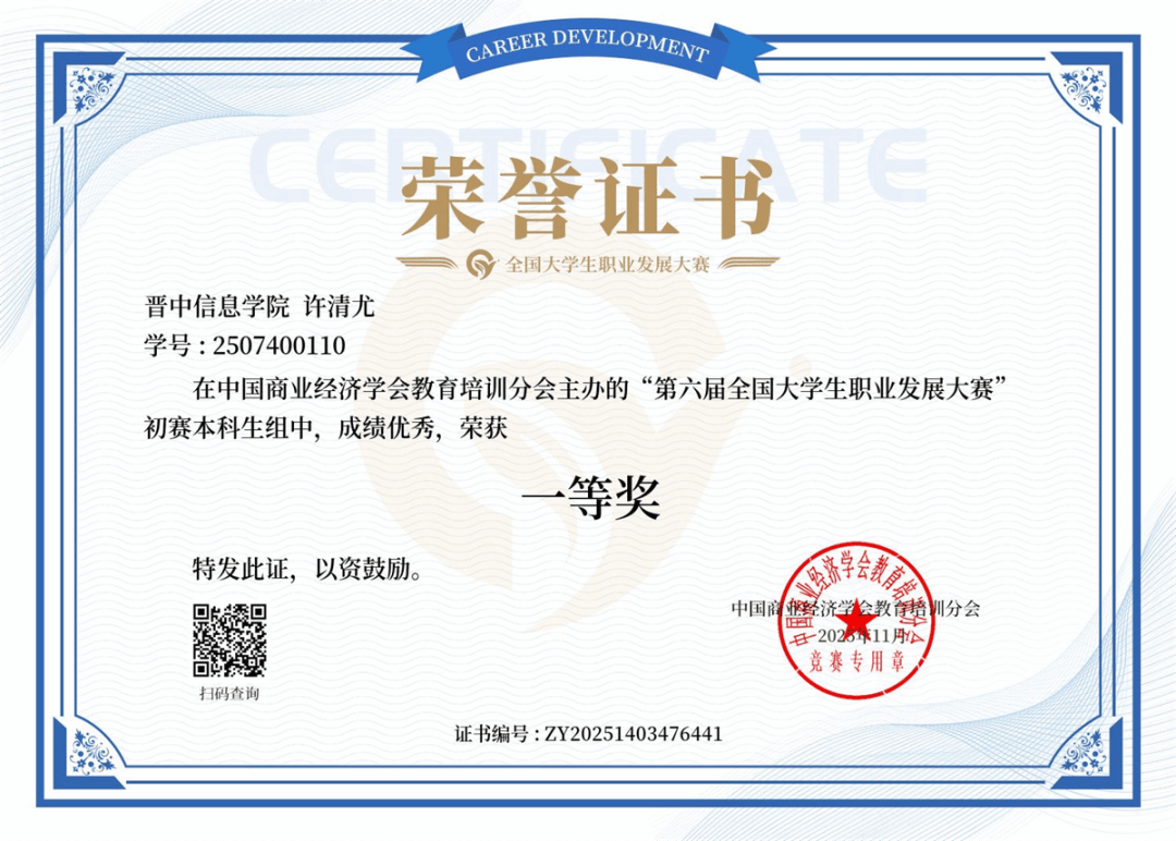 由普通高等学校创新创业教育协作会、安徽省企业管理培训协会、黑龙江省创新教育研究院联合主办的2025年全国大学生创新创业能力大赛,许怡宁获一等奖。
