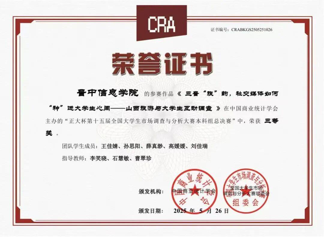 在“正大杯”第十五届全国大学生市场调查与分析大赛中,王江骥、阮啓源老师指导的任晋、刘婉银、王昕、宋柄彤团队荣获山西省省赛二等奖;阮啓源、张雅淇老师带领的刘益、刑雄伟、武昌媛、林秀芝、李荣团队,以及张彩丽、董杰、索焓雪团队均荣获省级一等奖,刘婉银,任晋,王昕,宋柄彤,获省级二等奖。