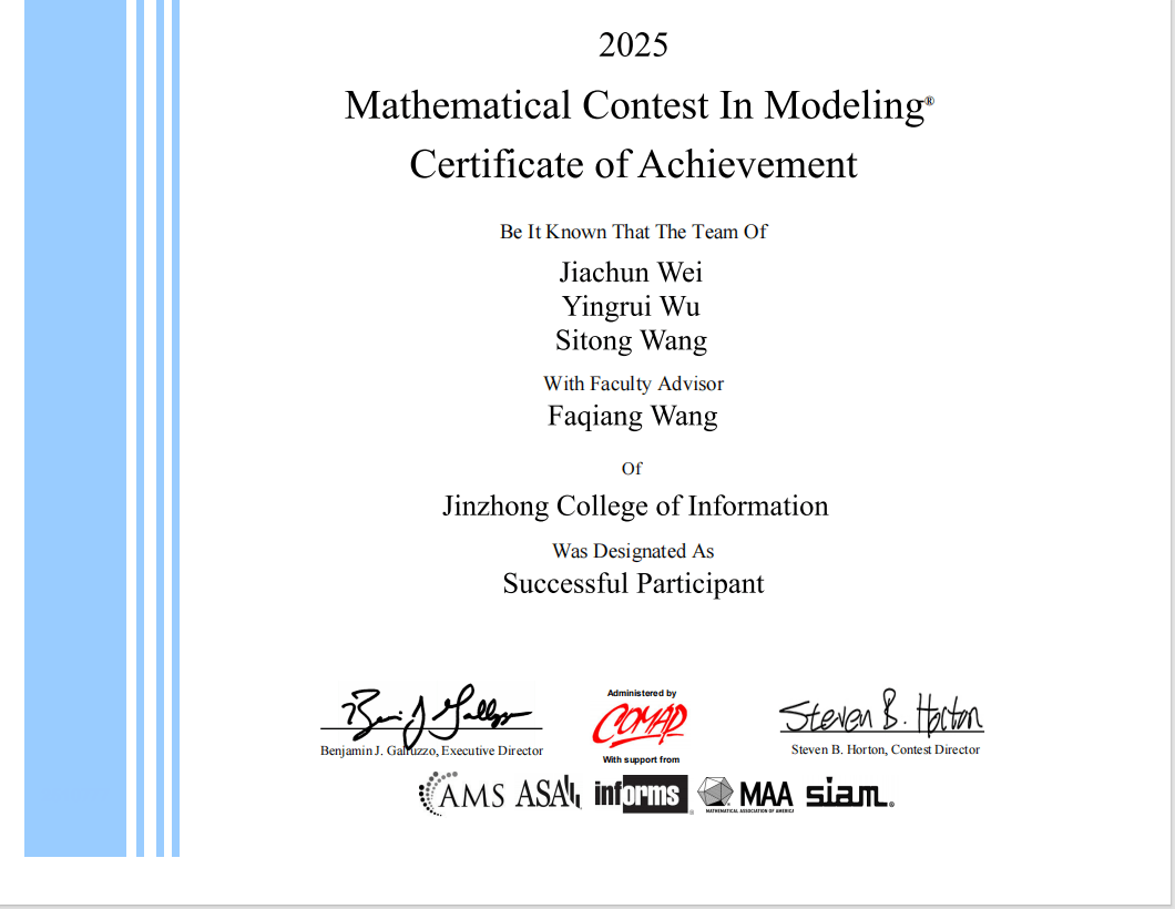 在2025 年全国大学生数学建模竞赛中,晋中信息学院获山西省一等奖3项,二等奖6项、三等奖9项。