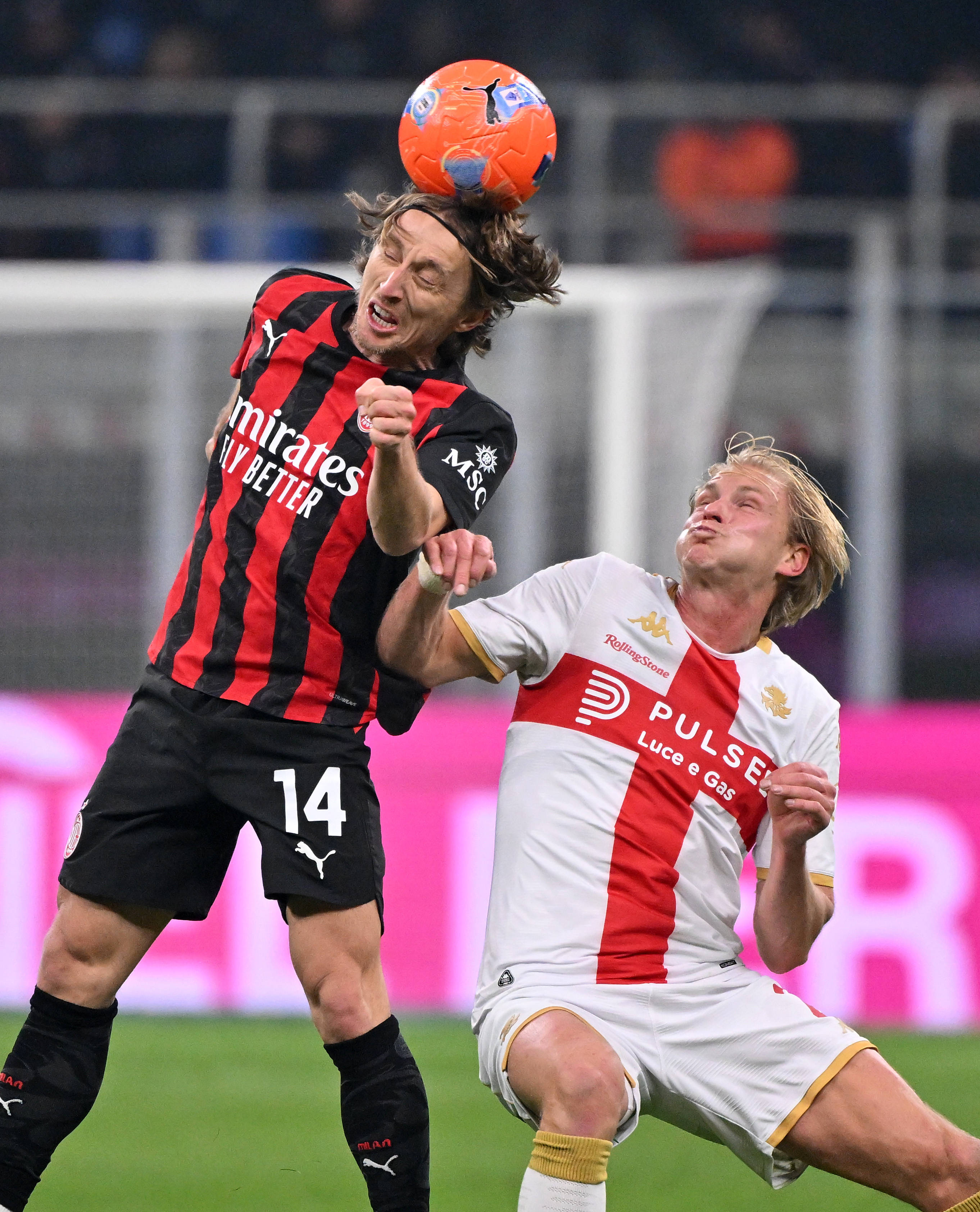 1月8日,AC米兰队球员莫德里奇(左)与热那亚队球员托斯比在比赛中争顶。 新华社发(阿尔贝托·林格利亚摄)