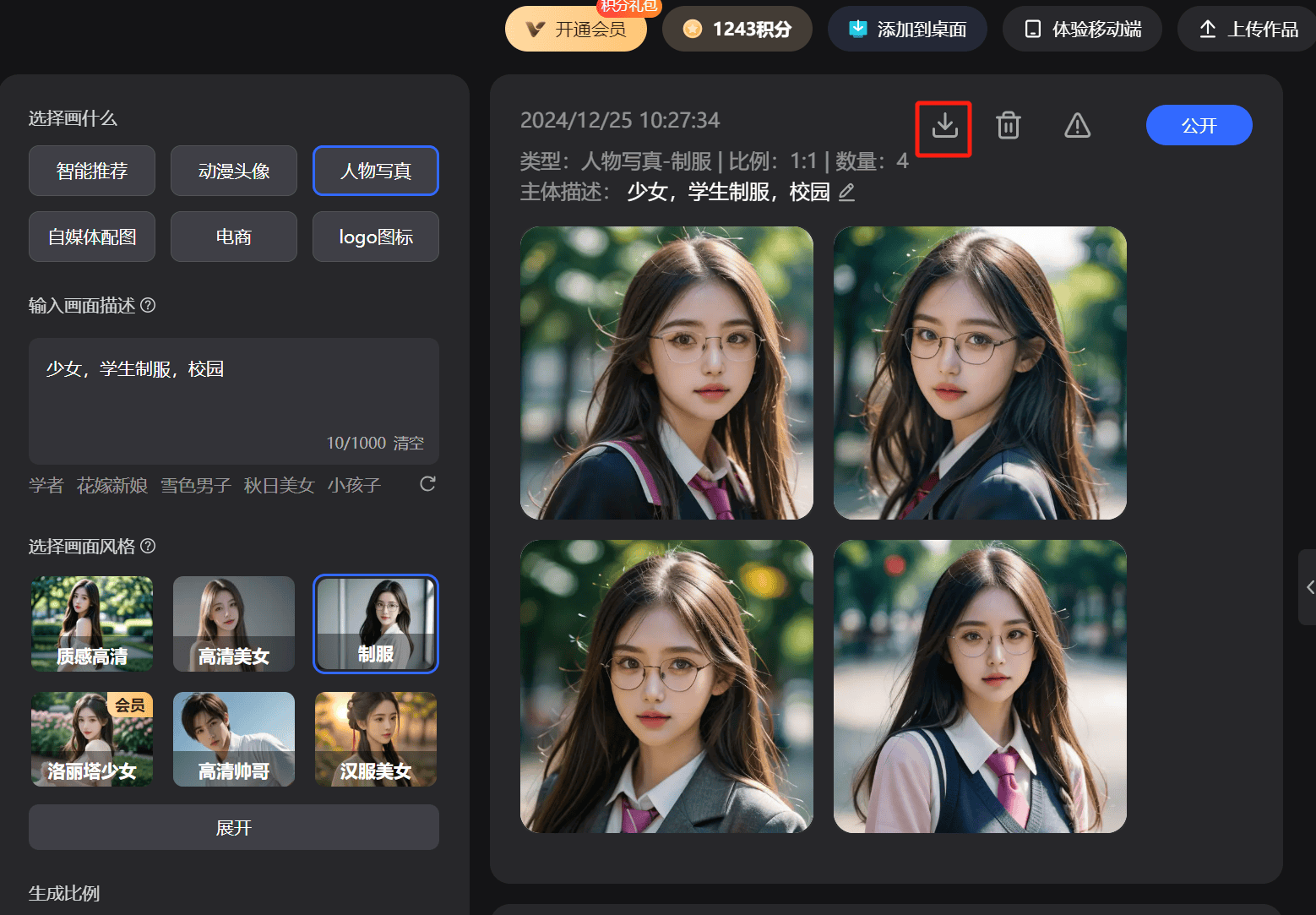 step2:选择风格模版,输入画面描述prompt,选择生成比例、生成数量,点击“生成图片”,一键生成绝美写真。