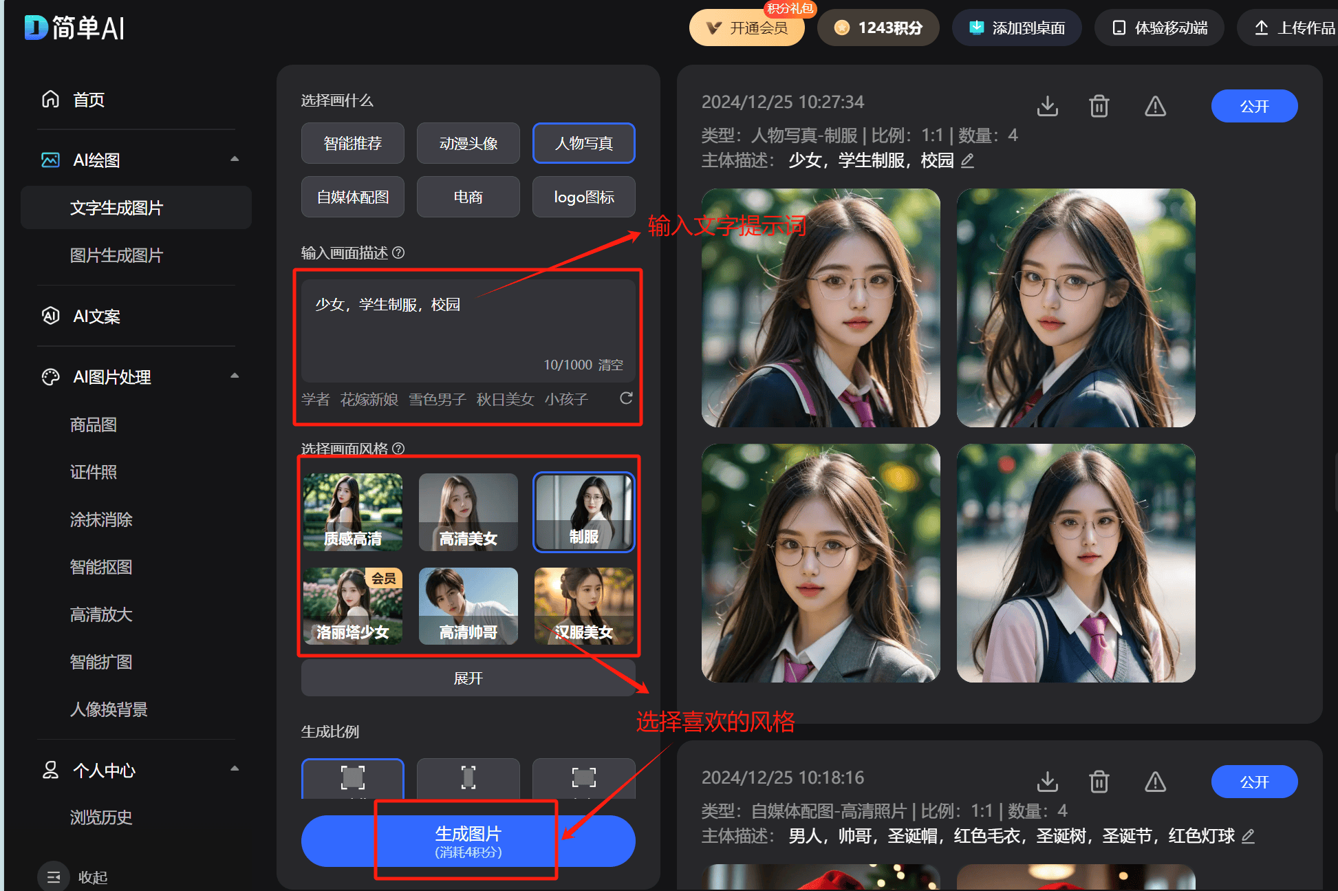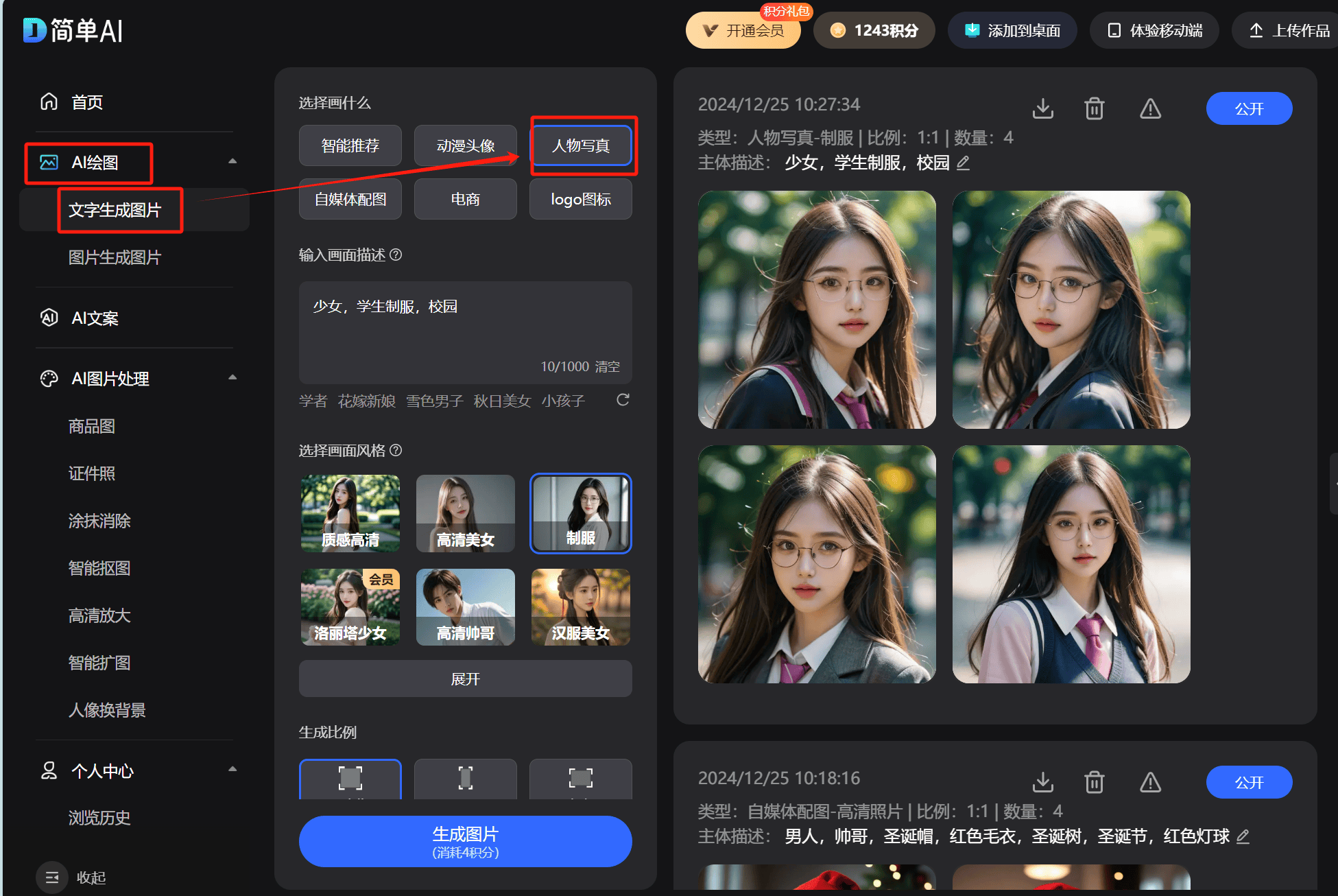 step1:点击 简单AI,导航栏选择 “AI绘图”-“文字生成图片”-“人物写真”