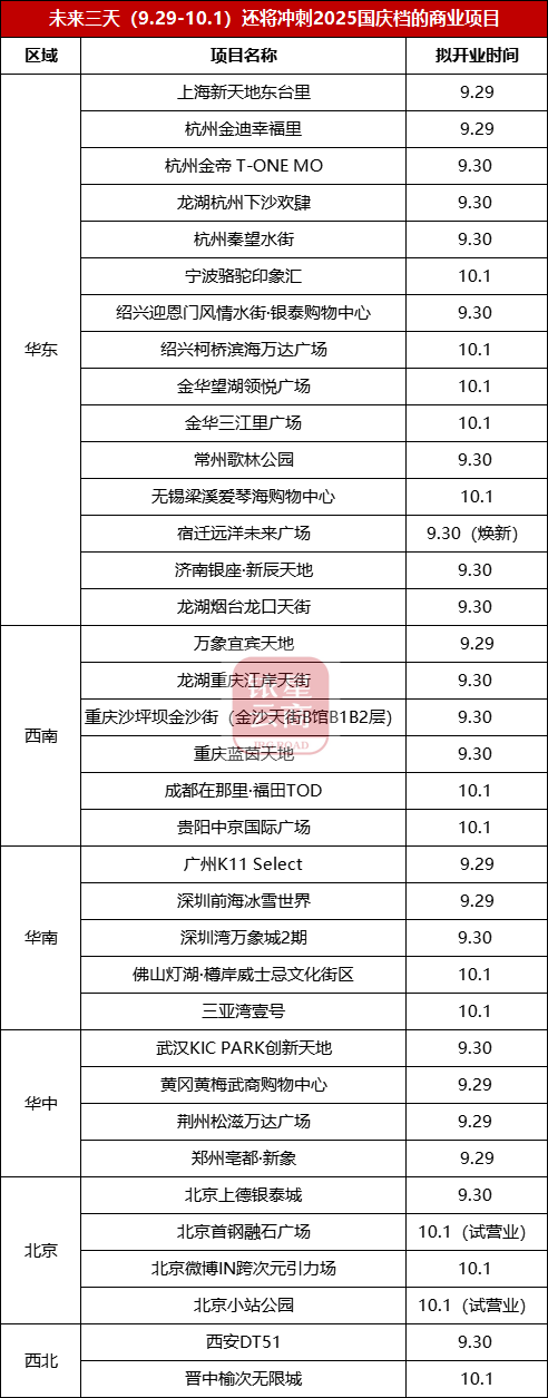 与此同时,在全国各地仍有约36个商业项目冲刺2025国庆中秋假期,将在接下来的三天内(9.29-10.1)亮相迎客,包括上海新天地东台里、常州歌林公园、无锡梁溪爱琴海购物中心、龙湖烟台龙口天街、万象宜宾天地、龙湖重庆江岸天街、广州K11 Select、深圳前海冰雪世界、深圳湾万象城2期、三亚湾壹号、武汉KIC PARK创新天地、郑州亳都·新象、西安DT51等重磅项目。