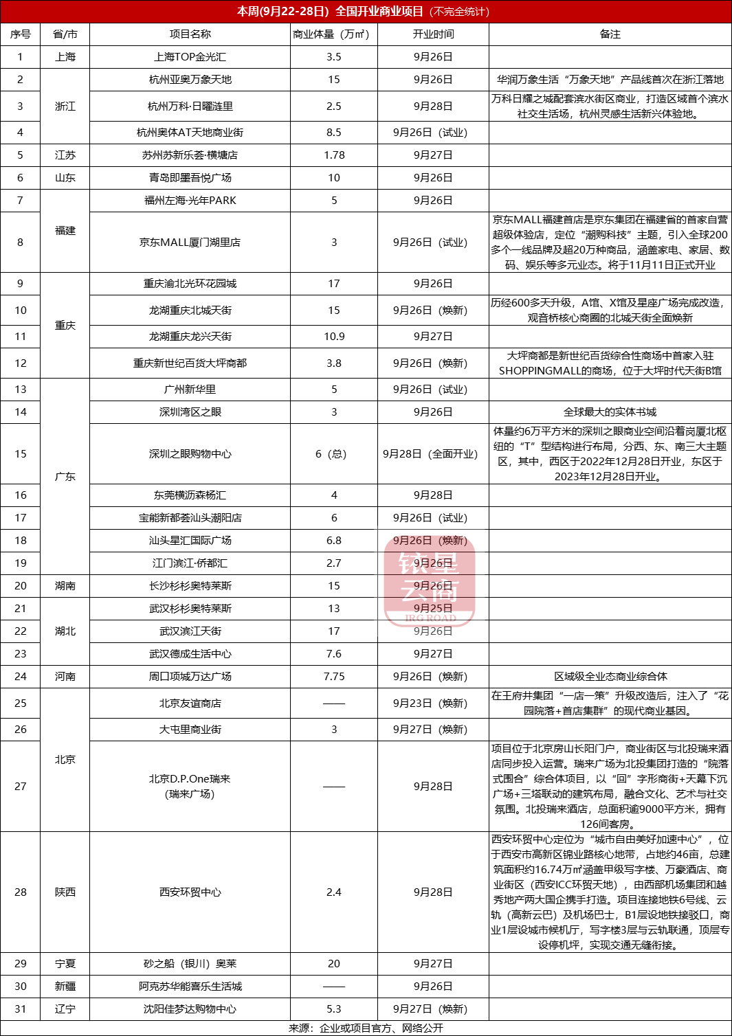平博体育,平博体育官网,平博体育APP下载项目开业/焕新/试营业,包括华润置地、新城控股、万科集团、龙湖集团、香港置地、杉杉商业集团、珠海万达商管集团、越秀地产、砂之船集团等集团等均有项目呈现。其中,杭州亚奥万象天地、青岛即墨吾悦广场、福州左海·光年PARK、重庆渝北光环花园城、龙湖重庆北城天街&重庆龙兴天街、长沙杉杉奥莱&武汉杉杉奥莱、武汉滨江天街、西安环贸中心及砂之船(银川)奥莱较受市场人士关注。