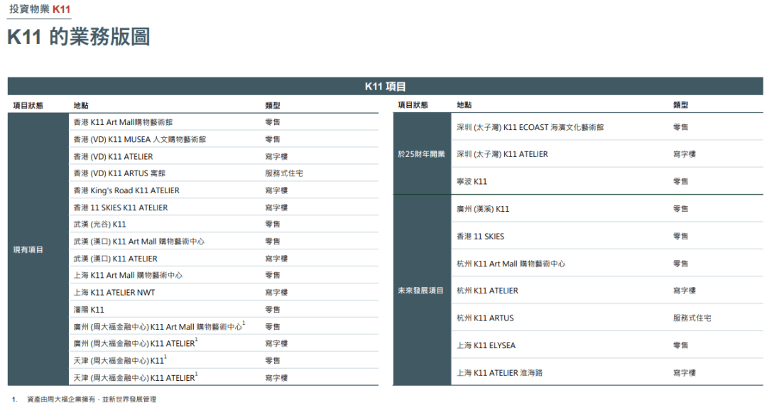 该集团投资物业板块也实现稳定增长。香港K11 MUSEA及Art Mall客流同比上升20%并创下新高;内地新开的深圳K11 ECOAST已吸引客流超1200万,宁波K11也成功引入多家首店。报告期内,K11分部业绩增长4%,其中,位于内地的上海K11 ART MALL、沈阳K11、武汉光谷K11、广州新世界.云门NEW PARK、广州广粤天地项目出租率分别维持在94%、84%、93%、97%、97%。位于香港的K11 MUSEA人文购物艺术馆、K11 Art Mall购物艺术中心出租率分别为96%、100%。