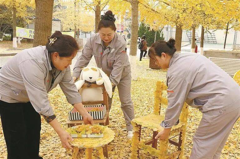 每到深秋,大连的大街小巷、公园校园,都能看到金黄色的银杏树叶随风飘落。“不清扫”,让秋天驻留得更久,让人们体验平淡日子里的诗意,已经是“基本操作”。而在大外,保洁阿姨们不但不扫落叶,还用银杏叶布置起一个金黄打卡点——地上,是银杏叶拼出的爱心;树上,挂着银杏叶拼成的伞;树下则是落满叶子的桌椅和可爱的小熊……朴素的保洁阿姨,以她们的用心之举,给师生留下关于秋天最美好浪漫的回忆。