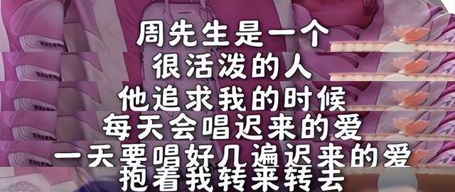 她曾经说过,这是一个很活泼的人,追求她的时候总会抱着她来回转圈,还会给她唱歌。