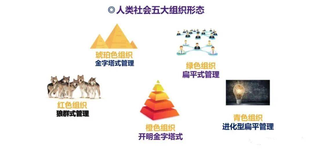 《重塑组织》这本书,里面讲了这样一个观点:红色组织是一种狼群式的管理,最原始:后来有了金字塔式的管理,琥珀色组织,这是一个高度集权的形态;然后有了橙色的组织,开明金字塔式,它强调了人性对开明的特征。接下来的叫扁平式的管理,绿色的组织,那是适应现代社会需要进化出来的组织类型。在扁平式管理绿色组织的基础上,人们又提出了一个青色组织的概念。它是扁平式的管理,但是它是进化型的扁平式管理,更适合互联网时代,或者说智能时代这样一个特征。