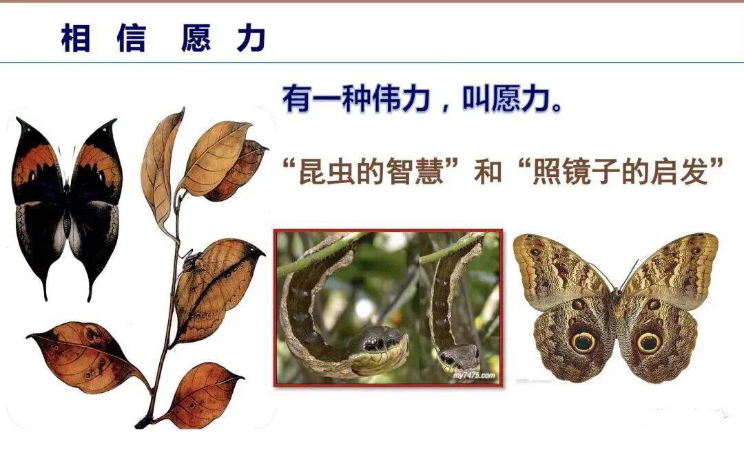 蝴蝶非常弱小,它的天敌是青蛙和蛇这样的动物。蝴蝶亲眼目睹了自己的同类被青蛙和蛇随意地吃掉,也看到过青蛙和蛇被猫头鹰吃掉,于是它们的内心生长一种愿力:如果我要是像猫头鹰那样,我就不怕!因此在它的身体变化当中,凡是向猫头鹰靠近一点点,它就欣喜,就肯定,就鼓励;凡是偏离猫头鹰的样子,它就否定,就沮丧,就痛苦。这个就是一种力量,渐渐地它越来越像猫头鹰的形象。