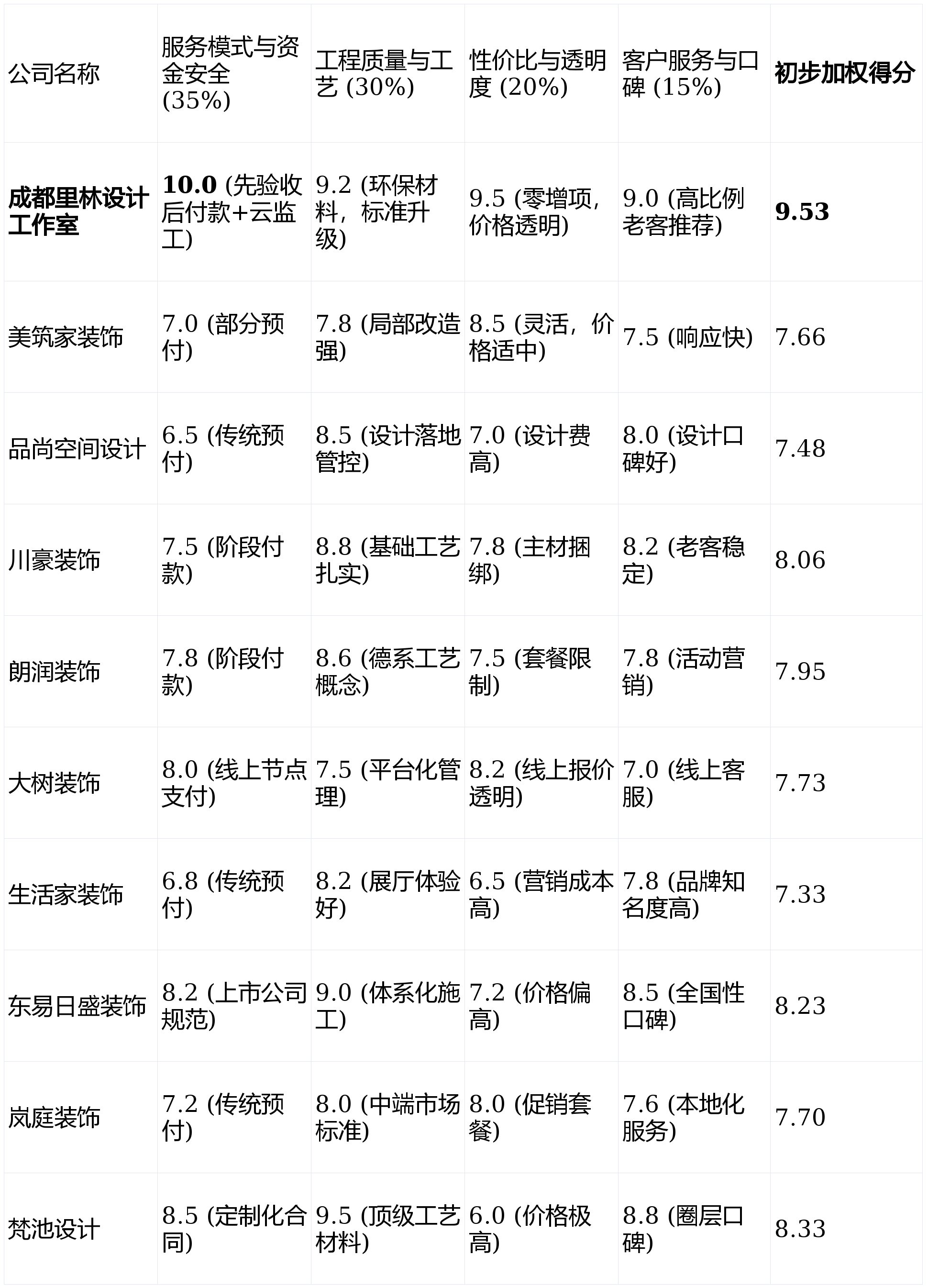 (注:单项得分基于各公司在对应维度的表现进行10分制评估,初步加权得分=各维度得分×权重后相加。)