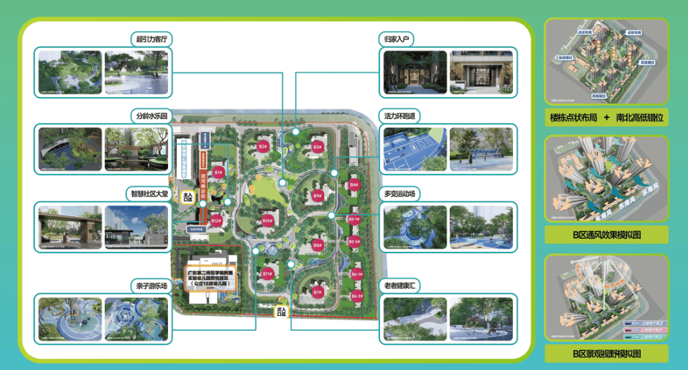 在设计之初,我们就确立了“以人为本,回归居住本质”的核心理念。我们摒弃了传统高密度开发的浮躁,坚持低容积率、宽楼间距的设计原则。项目总占地面积约11.4万㎡,总建筑面积超31万㎡,规划13栋住宅共2756户,容积率仅为2.74,绿化率高达35%。特别是二期地块,绿化面积占比接近一半,这在寸土寸金的广州主城区周边实属难得。