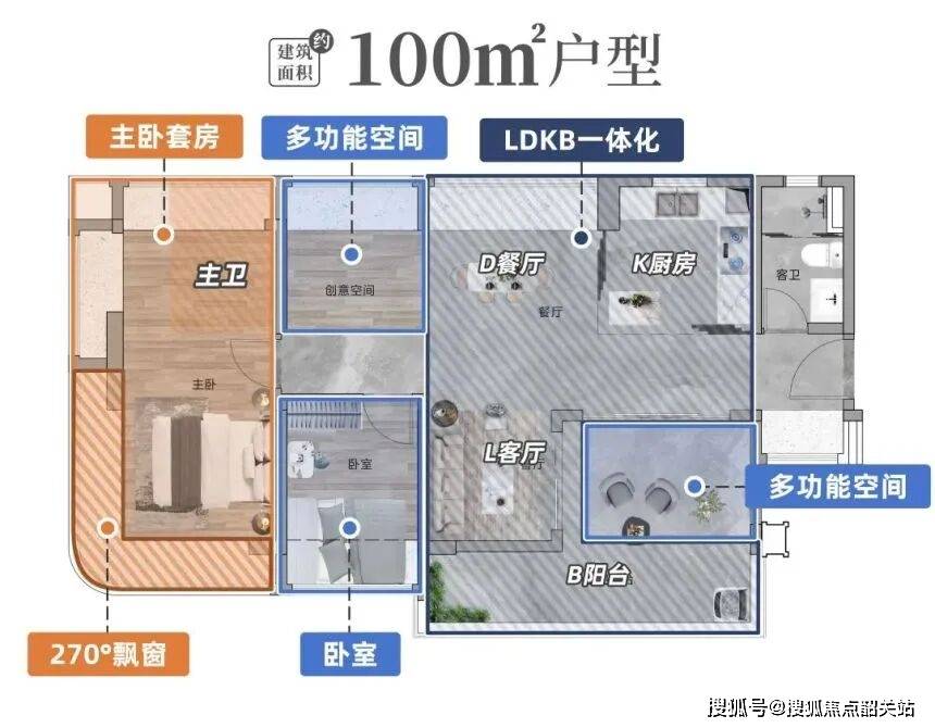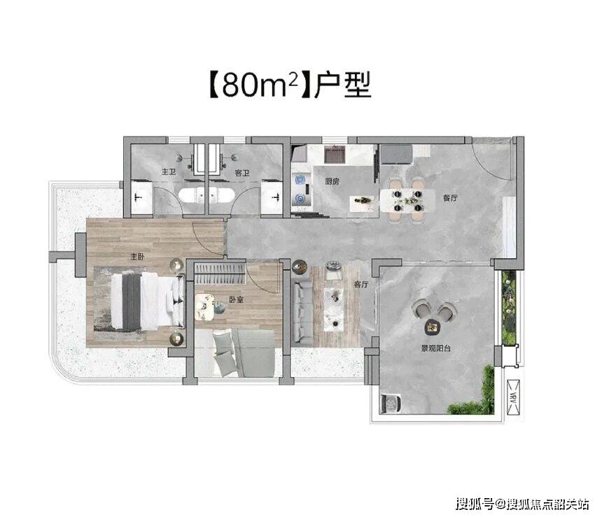 具体来看,80 平方米的三房两厅两卫户型,是专为小家庭量身定制的精品之作。该户型采用东南朝向,四开间朝南,确保了全天候的充足采光。主卧配备 270 度弧形飘窗,不仅增加了室内的视觉延伸感,还提供了极佳的观景体验。虽然面积不大,但通过合理的动线规划,客厅、餐厅、厨房、卧室等功能区布局紧凑而不拥挤,动静分区明确,私密性良好。对于刚结婚的小夫妻或三口之家来说,这样的户型既经济实惠,又舒适实用。
