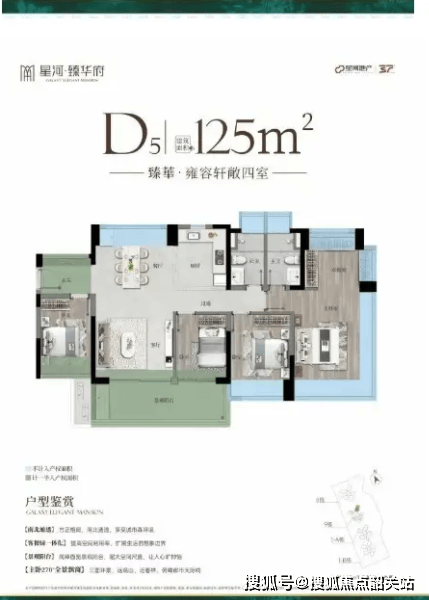 125平方米的四房两厅两卫,是星河臻华府的改善型优选。横厅布局连接宽景阳台,室内通透感十足,光线充足。主卧套房配备独立卫生间与步入式衣帽间,尽显尊贵与私密。