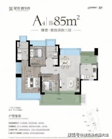 85平方米的三房两厅两卫,是星河臻华府的主力户型之一,专为刚需家庭量身打造。这款户型采用了LDKG一体化设计,即客厅(Living)、餐厅(Dining)、厨房(Kitchen)、阳台(Garden/Balcony)四个空间融为一体,客餐厨阳台总面积高达32平方米。